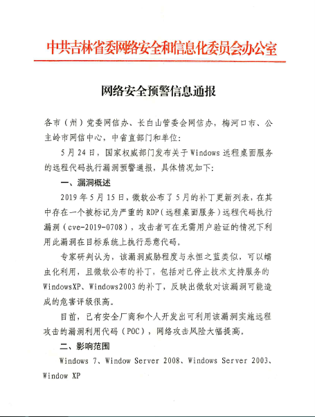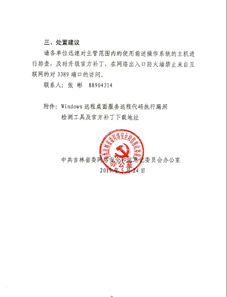 根据省委网信办《网络安全预警信息通报》的要求,我校已在防火墙上封禁了3389端口,也请师生员工及时升级官方补丁,有效防范网络漏洞攻击。